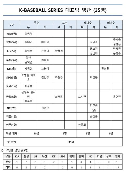 한국야구위원회(KBO)는 총 35명으로 구성된 'K-베이스볼 시리즈' 야구 대표팀 명단을 지난 12일 발표했다. 이번에 차출된 선수들은 11월 8일과 9일 서울 고척스카이돔에서 체코 대표팀과 2연전, 같은 달 15일과 16일에는 일본 도쿄돔에서 일본 대표팀과 2연전을 치른다. 체코와 일본은 내년 3월 열리는 월드베이스볼클래식(WBC) C조에서 류지현 감독이 이끄는 야구 대표팀이 상대해야 할 맞수. KBO는 이번 시리즈를 통해 WBC 경쟁팀의 전력을 사전에 탐색할 수 있을 것으로 기대한다.