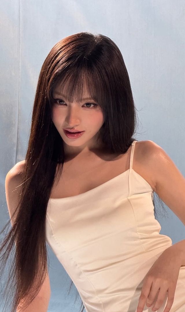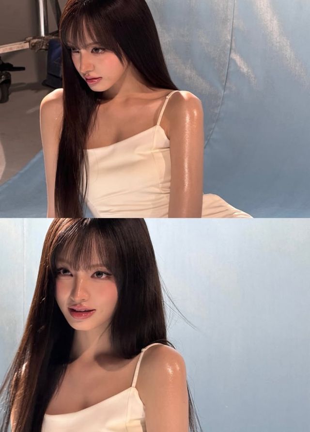 공개된 사진 속 리즈는 아이보리 슬립 드레스를 입고 카메라를 응시하고 있다. 은은한 조명 아래 윤기 나는 생머리와 투명한 피부가 어우러지며, 청초하면서도 매혹적인 분위기를 완성했다.
