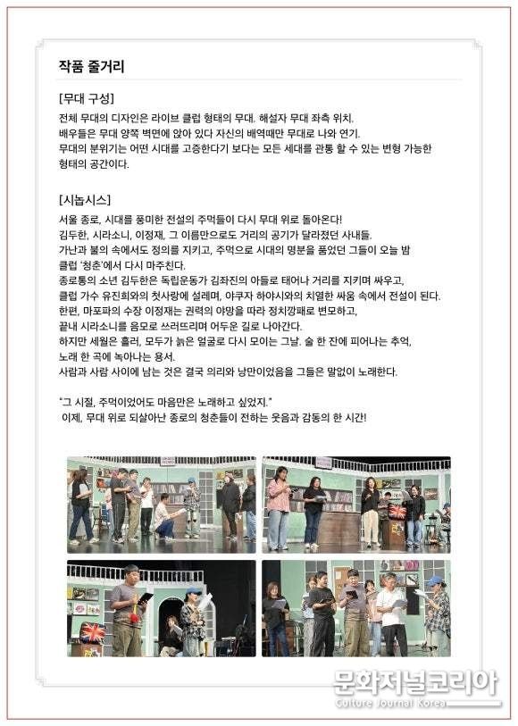 세월이 흘러 다시 만난 이들은 술 한 잔과 노래 한 곡에 지난 세월을 회고하며, 결국 사람 사이에 남는 것은 의리와 낭만임을 보여준다. 무대는 특정 시대 고증에 머무르지 않고, 모든 세대를 아우르는 라이브 클럽 형태로 디자인되었다. 배우들은 무대 벽면에 앉아 있다가 배역이 시작되면 등장하는 방식으로 진행되어, 관객과의 몰입도를 높인다.