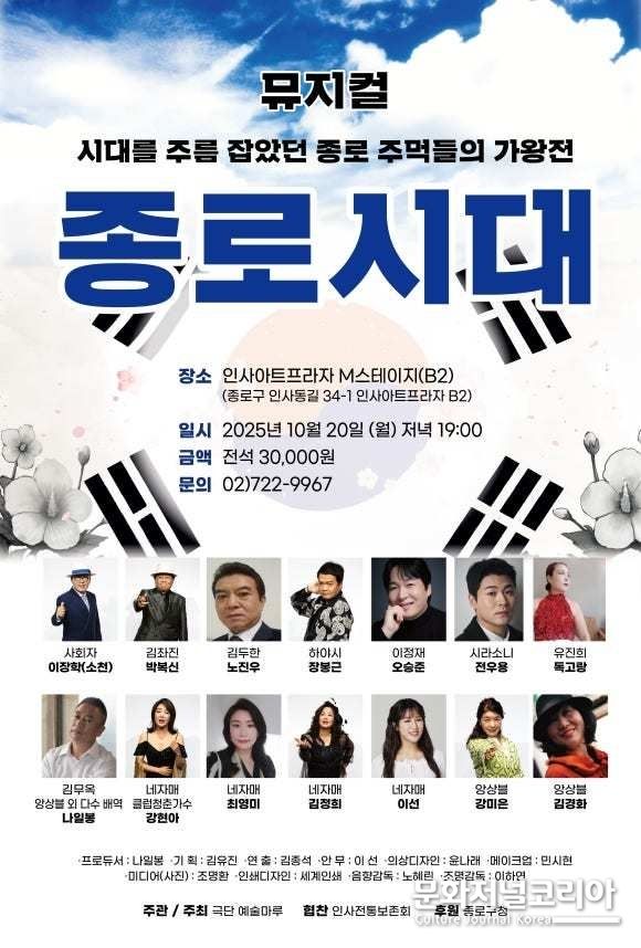 창작 뮤지컬 종로시대_종로가왕전10월 20일(월), 인사아트프라자 M스테이지에서 공연 극단 예술마루가 주최하는 창작 뮤지컬 종로시대_종로가왕전이 오는 2025년 10월 20일(월) 저녁 7시 서울 종로구 인사동 인사아트프라자 M스테이지(B2)에서 막을 올린다.