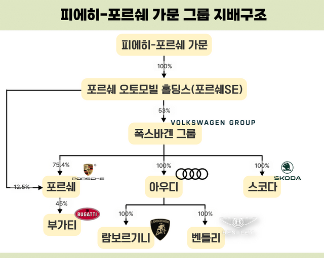 폭스바겐그룹에 대한 피에히-포르쉐 가문의 영향력은 100% 지분을 보유한 '포르쉐오토모빌홀딩스'(이하 포르쉐SE)에서 나온다. 현재 포르쉐SE는 폭스바겐그룹의 지분(의결권 기준) 53%를 보유하고 있다. 폭스바겐그룹은 포르쉐, 아우디, 스코다, 세아트, 두가티, 벤틀리, 람보르기니 등 유명 자동차·모터사이클 기업을 자회사·손자회사로 두고 있다. 일반인들에게 널리 알려진 대부분의 자동차 브랜드를 두 가문이 보유했다고 봐도 과언이 아닌 구조다.