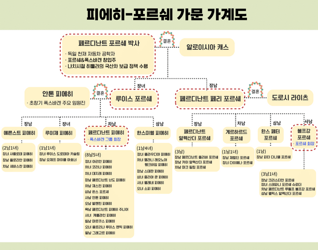 그 시기 페르디난트의 장녀 루이스 포르쉐는 당시 폭스바겐 그룹의 핵심 임원인 '안톤 피에히'와 결혼해 성을 '피에히'로 바꿨다. 가문의 일원이 된 안톤은 창립자 페르디난트의 이름을 딴 또 하나의 자동차 브랜드인 '포르쉐'를 출범시켰다. 이후 폭스바겐은 페르디난트의 장녀 '루이제 피에히'의 자손들이, 포르쉐는 장남 '페리 포르쉐'의 자손들이 각각 경영을 책임지며 분리경영 체제를 구축했다. 두 가문 소유의 지주회사 '포르쉐SE' 중심의 지배구조 체제도 갖췄다.