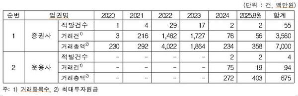 뉴시스 보도에 따르면, 13일 국회 정무위원회 소속 추경호 국민의힘 의원이 금융감독원으로부터 제출받은 자료에 따르면 지난 5년(2021년~2025년 8월) 간 증권사 임직원의 차명계좌 사용 적발 내역은 54건을 기록했다. 거래 종목수는 3557개, 투자 원금은 약 70억원이다.