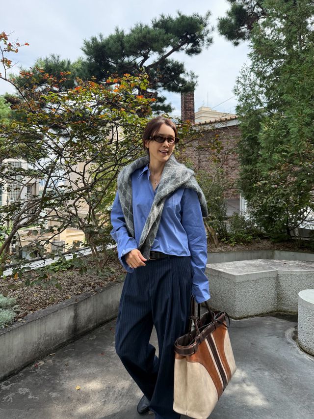 채정안은 블루 셔츠에 아가일 패턴의 니트 자켓을 매치해 세련된 분위기를 완성했다. 편안하면서도 시크한 스타일로 ‘사복 장인’다운 감각을 드러냈다.