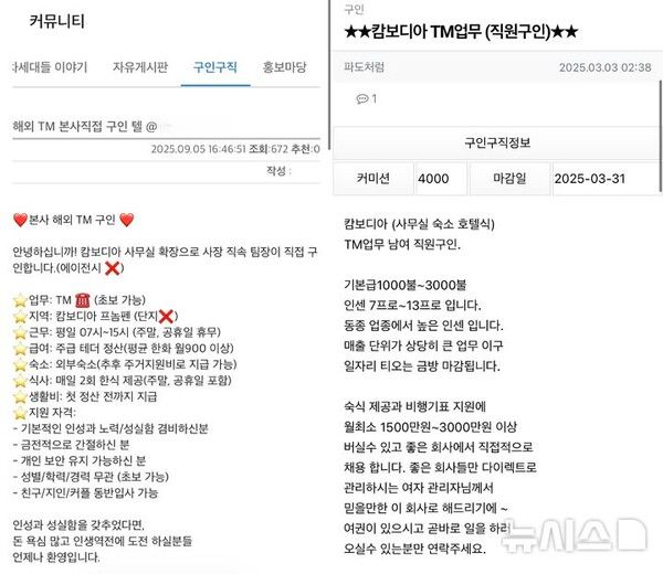 유럽 한인 커뮤니티에는 '본사 해외 TM 구인' 글이 올라왔다. 캄보디아 프놈펜에서 한 주에 한화로 900만원 이상을 벌 수 있으며 숙식이 제공된다고 적혀 있었다. 지원 자격은 '금전적으로 간절하신 분' '개인 보안 유지 가능하신 분' 등이었다.