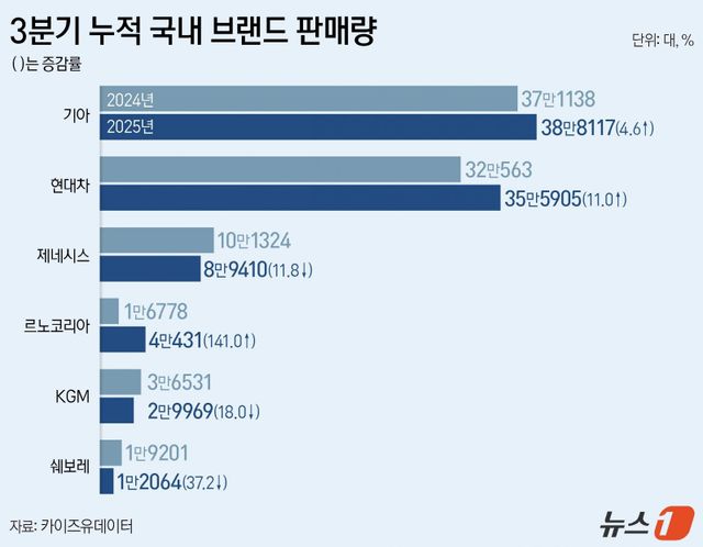 판매량 증가 속 브랜드별 성적은 엇갈렸다. 국산차 가운데 기아(000270)가 38만 8117대를 판매하며 전년 대비 4.6% 증가, 1위를 차지했다. 현대차(005380)는 35만 5905대로 11% 늘어나며 2위에 올랐다. 르노코리아는 ‘그랑 콜레오스’ 판매 호조에 힘입어 4만 431대를 기록, 무려 141% 증가했다.