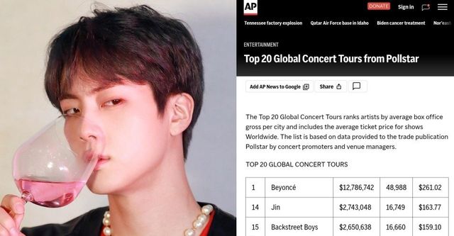방탄소년단(BTS) 진이 미국 폴스타(Pollstar)가 발표한 ‘글로벌 콘서트 투어 톱20’에서 도시당 평균 수익 274만3048달러로 세계 14위를 차지했다. 아시아 솔로 아티스트로는 최고 순위이자, 그룹을 포함한 모든 아티스트 중 단독으로 이름을 올린 유일한 아시아 솔로였다.