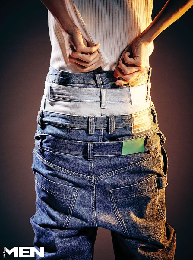 골지 티셔츠 Celine, 데님 버뮤다팬츠 Levi’s, 연청색 데님 팬츠 Dior Men, 1980 D-에퍼 팬츠 Diesel, 빈티지 인디고 스트레이트 진 Bottega Veneta.