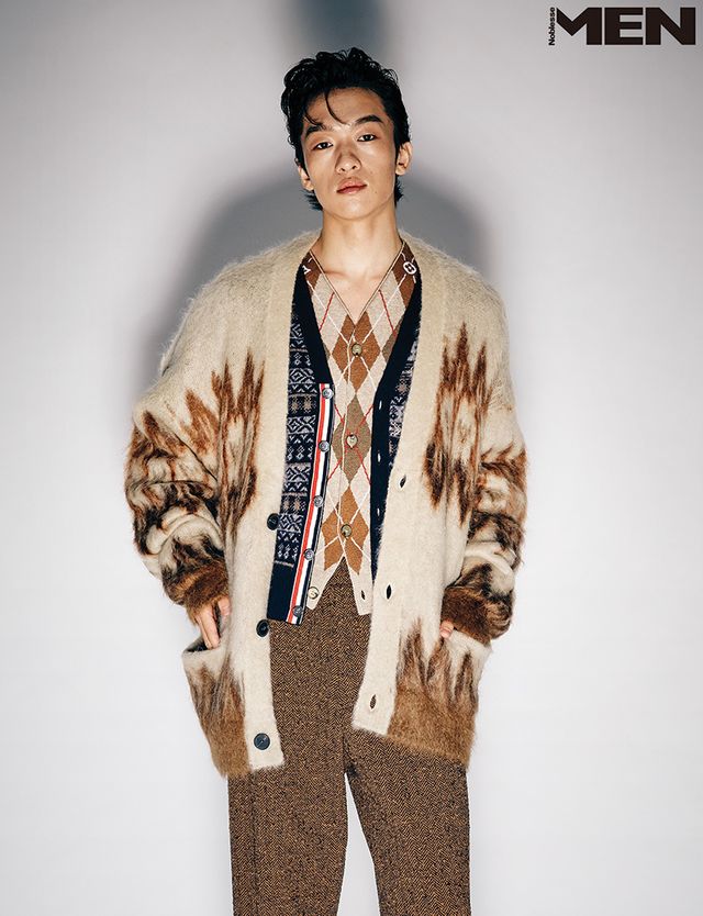 아가일 인타르시아 니트 베스트와 헤링본 패턴 드로스트링 팬츠 모두 Louis Vuitton, 페어 아일 패턴 카디건 Thom Browne, 모헤어 혼방 닐슨 카디건 Isabel Marant.