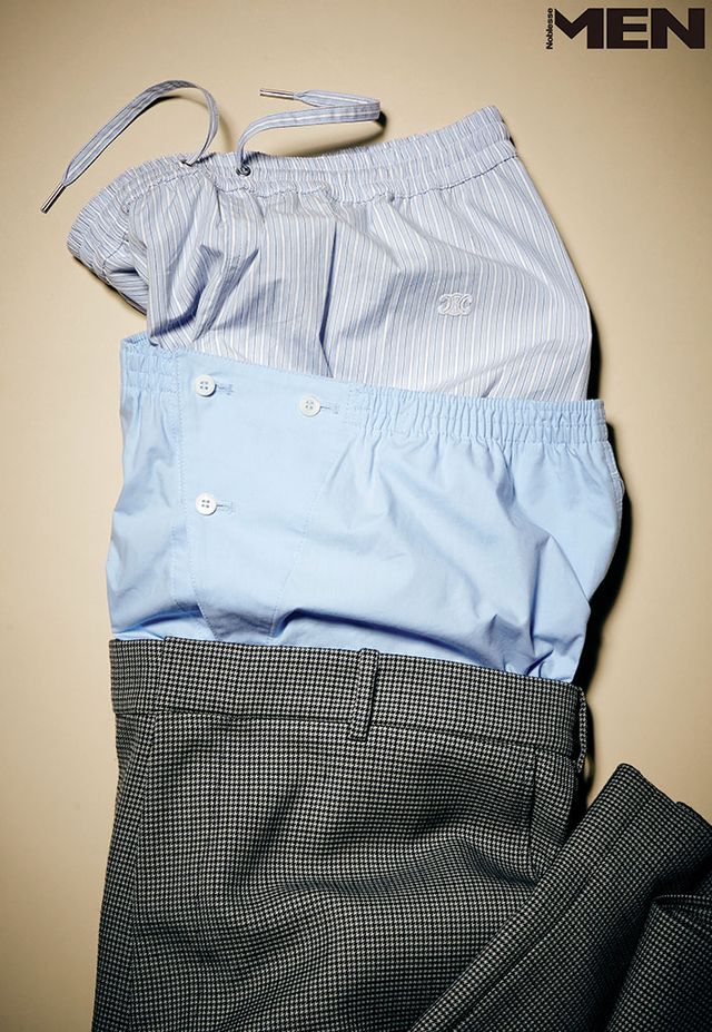 위부터_ 스트라이프 패턴 파자마 팬츠 Celine, 스카이블루 코튼 팬츠 Prada, 하운즈투스 패턴 테일러드 팬츠 Coach.