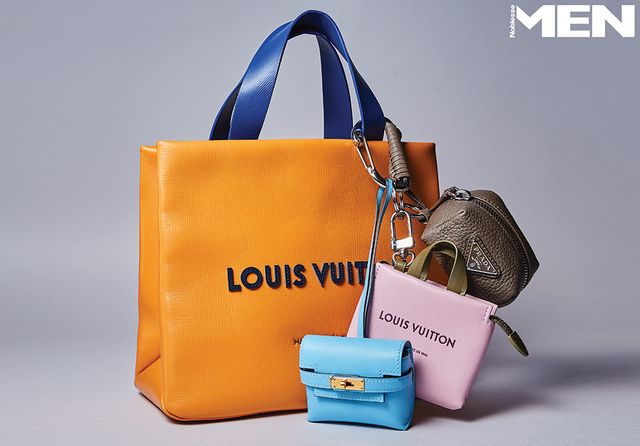 미니 쇼퍼 토트백과 핑크 LV 미니 백 참 모두 Louis Vuitton, 선명한 스카이블루 에어팟 케이스 Herme`s, 삼각 로고 장식 파우치형 참 Prada.