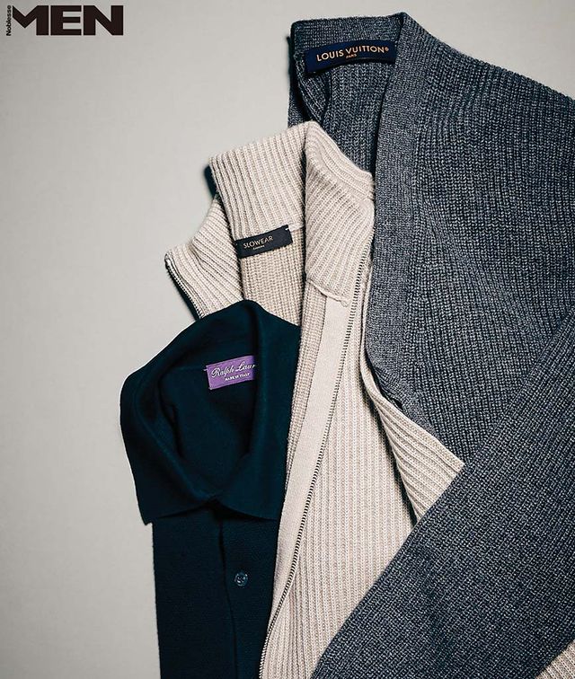 위부터_ 브이넥 그레이 카디건 Louis Vuitton, 캐시미어 집업 카디건 Slowear, 실크와 코튼 혼방 셔츠 카디건 Ralph Lauren Purple Label.