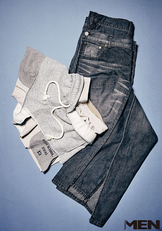 왼쪽부터_ 스웨트 쇼츠를 해체주의적으로 레이어드한 팬츠 Acne Studios, 앞 플랩을 덧댄 비대칭 데님 팬츠 Junya Watanabe × Levi’s.