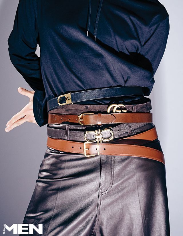 위부터_ 저지 후드 톱 Courre`ges, V 로고 앤티크 버클 벨트 Valentino Garavani, 더블 G 버클 브라운 스웨이드 벨트 Gucci, 웰링턴 스터럽 버클 벨트 Ralph Lauren Purple Label, 간치니 로고 버클 벨트와 레더 팬츠 모두 Ferragamo, 사각 버클 브라운 벨트 Miu Miu.