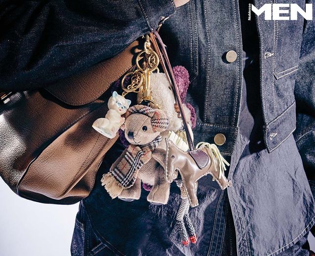 왼쪽부터_ 크롭트 재킷, 셔츠, 데님 팬츠 모두 Lemaire. 브리앙 템포 시나몬 숄더백 Delvaux, 고양이 모티브의 세라믹 참 Valentino Garavani, 귀마개와 스카프를 맨 토마스 베어 참 Burberry, 코끼리 형태 인형 참 Coach, 레더 소재 말 모티브 참 Herme`s, 아이코닉 룩을 입은 크로셰 트릭 참 Miu Miu.