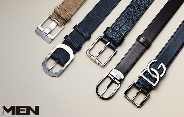 왼쪽부터_ 베이지 스웨이드 벨트 Tod’s, 빈티지 메탈 버클 벨트 Celine, 롤러 커브 버클 벨트 Loewe, 말발굽형 버클 리버서블 벨트 Montblanc, 메탈 DG 로고 장식 벨트 Dolce&Gabbana.