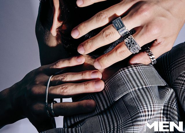 왼쪽부터 시계 방향으로_ 글렌 체크 패턴 재킷은 Caoch, 샹당크르 모티브의 트리플 링 Herme`s, 레터링 음각 링 Acne Studios, 앤티크한 마감의 실버 링 Chrome Hearts, LV 체인 링크 링 Louis Vuitton.