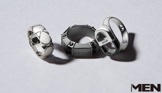 왼쪽부터_ 방패에서 영감받은 음각 디테일의 실드 세그먼트 링 Burberry, 크리스털 장식 링 McQueen, 디올 8 모티브 오픈워크 링 Dior Men.