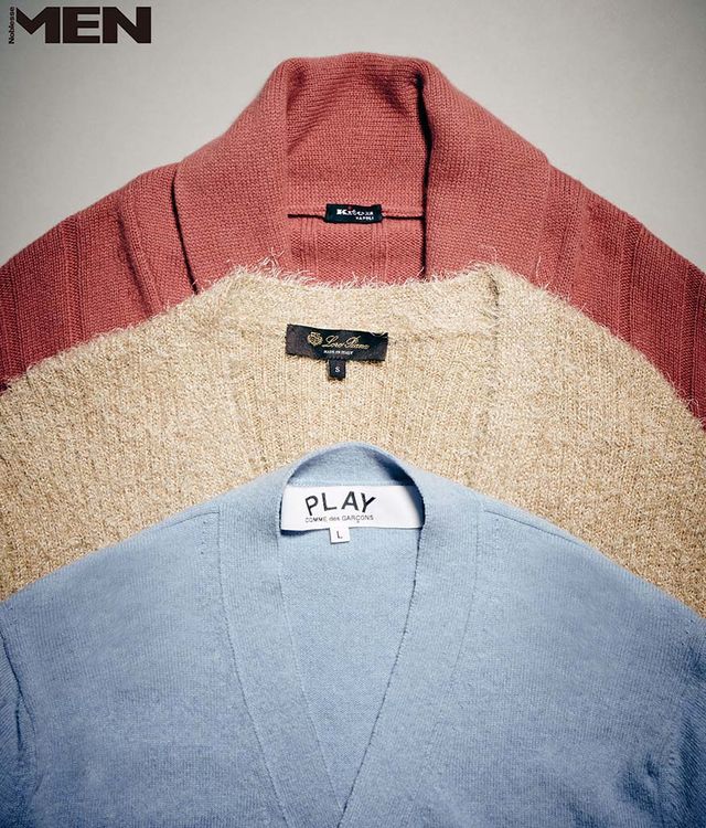 위부터_ 숄칼라 카디건 Kiton, 헤어리한 소재의 페루비안 릴리 카디건 Loro Piana, 라이트 블루 니트 카디건 Play Comme des Garçons.