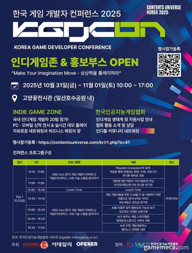 KGDCon 2025는 '상상력을 플레이하라(Make Your Imagination Move)'를 주제로 열리는 2025 콘텐츠 유니버스 코리아(Contents Universe Korea 2025)와 함께 운영된다. 넥슨게임즈 권민섭 연구원, 네오위즈 이재호 Ai연구원, 루나톤 현바로 대표, 수상한편의점을 개발한 일레븐닷스튜디오 서희수 대표 등 게임산업 내 전문가들이 컨퍼런스 연사로 참여한다.