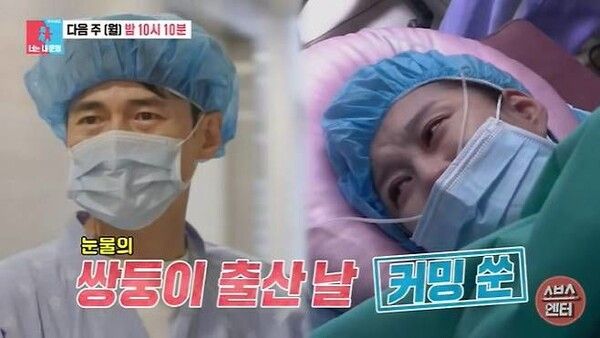 "노산에 쌍둥이 출산이라 만삭에 제왕절개 날짜 잡아 놓고 조기진통으로 너무 불안하고 걱정되고 아팠는데, 많은 분들의 기도와 축복 속에서 우리 가족 드디어 만났다. 이제 3명에서 5명으로 새로운 챕터를 열겠다."