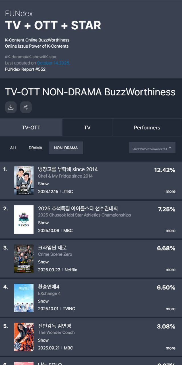 굿데이터코퍼레이션이 발표한 10월 2주차 순위는 2025년 10월 6일부터 2025년 10월 12일까지 방송 또는 공개 중이거나 예정인 TV 비드라마와 OTT 오리지널 비드라마 그리고 각 프로그램에 출연한 출연자와 게스트를 조사 대상에 포함하였다.