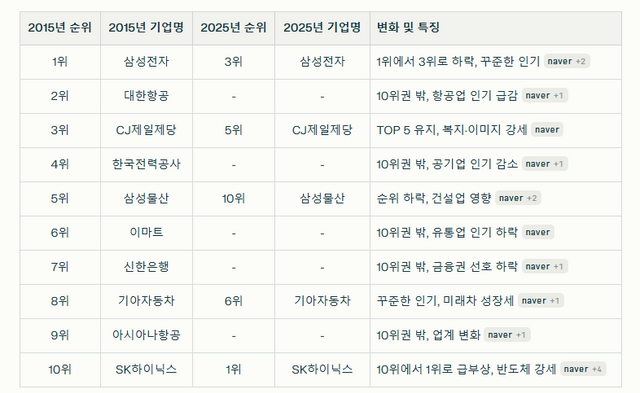 10년 동안 산업 변화와 구직자의 가치관 변화로 인기 기업의 순위에도 큰 변화가 있었습니다.2015년 대학생 취업 선호 기업 TOP 10의 현재(2025년) 순위 변동은 다음과 같습니다.