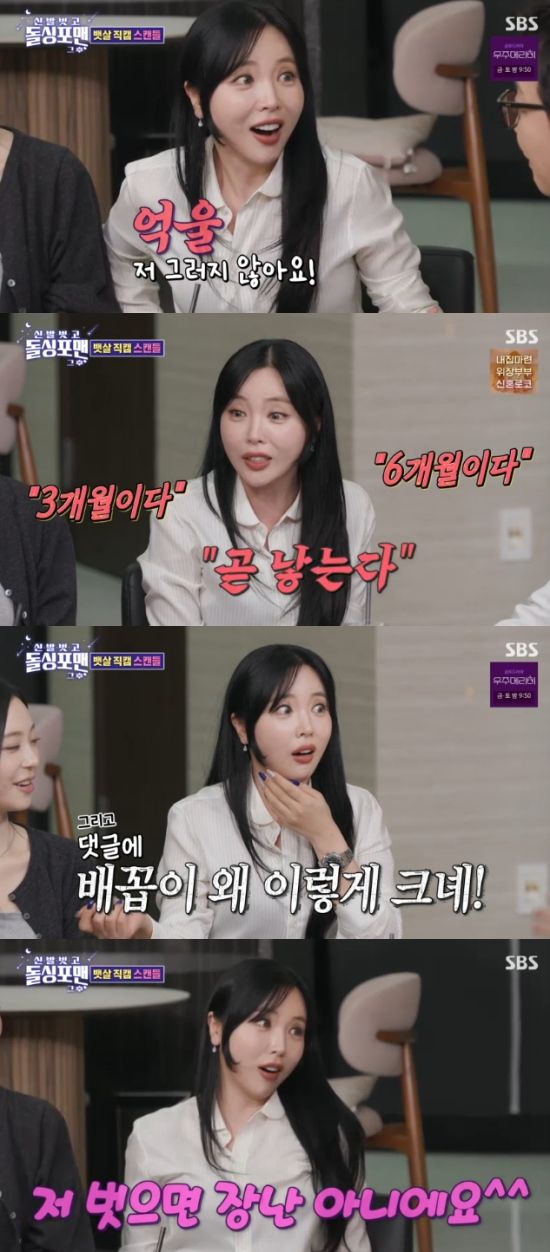 홍진영은 "계속 영상이 양산되고 있다. 저거 찍으신 분 너무하다. 저 정도는 아니다"면서 "'곧 출산한다' '배꼽이 너무 크다' 이런 댓글을 보면 상처를 받는다. 그런데 (영상처럼) 그렇지 않다"고 했다.