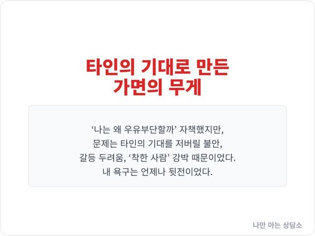 그렇게 만들어진 ‘착한 아이’라는 가면은, 성인이 되어서도 벗는 법을 잊은 채 사회생활과 모든 인간관계에서 자동적으로 작동하는 생존 전략이 되어버립니다.