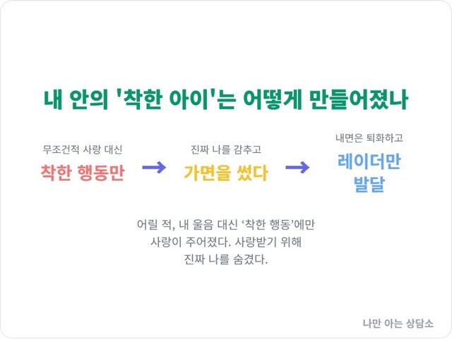 “나의 진짜 모습대로 행동하면 사랑받을 수 없어. 사랑받으려면 ‘착한 아이’가 되어야만 해.”
