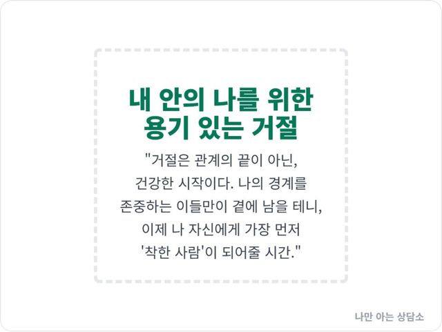 거절은 관계의 끝이 아니라, 건강한 관계의 시작을 알리는 신호입니다. 나의 경계선을 존중해주는 사람만이 내 곁에 남게 될 것이며, 그렇게 맺어진 관계는 이전보다 훨씬 더 진실하고 단단할 것입니다. 이제, 다른 누구도 아닌 나 자신에게 가장 먼저 ‘착한 사람’이 되어줄 시간입니다.