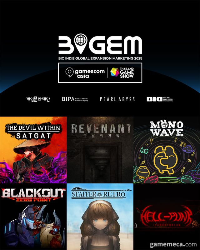 게임문화재단, 부산정보산업진흥원, 펄어비스, 부산인디커넥트페스티벌조직위원회(이하 BIC 조직위)는 올해 '빅잼(BIGEM, BIC Indie Global Expansion Marketing)' 사업에 선정된 국내 인디게임의 게임스컴 아시아 X 태국 게임쇼 2025 전시 참여를 지원한다.