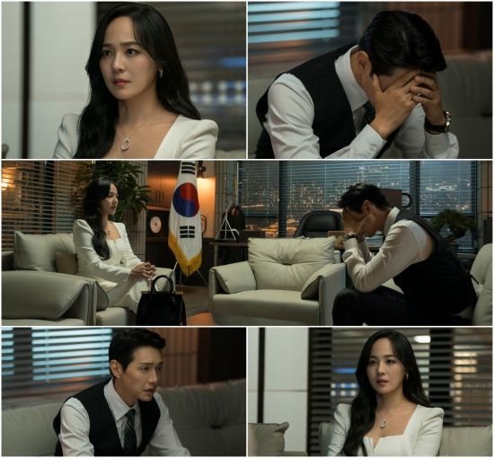 이런 가운데 15일 방송될 ‘퍼스트레이디’ 7회에서는 유진과 지현우가 심장이 조여오는 긴장감 속 결단을 앞둔 ‘풍전등화 압박 독대’로 시선을 강탈한다. 극 중 차수연과 현민철이 싸늘한 공기 속에서 마주 보고 앉은 장면. 차수연은 단호하다 못해 냉철한 눈빛으로 현민철을 향해 일성을 날리고, 현민철은 참다못해 양손으로 얼굴을 감싼 채 당혹감과 절망을 드러낸다. 두 사람 모두 서슬 퍼렇게 흑화한 듯 독설을 쏟아내면서 잔혹한 운명을 드리운 ‘결정적 담판’에 귀추가 주목된다.
