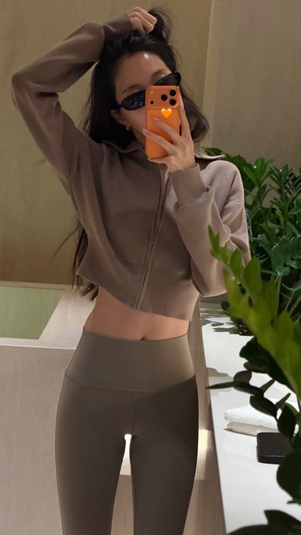 손나은은 15일 자신의 인스타그램 스토리에 거울 셀카를 공개했다. 사진 속 손나은은 베이지 톤의 짧은 집업과 밀착 레깅스를 매치, 건강미 넘치는 애슬레저룩을 선보였다.