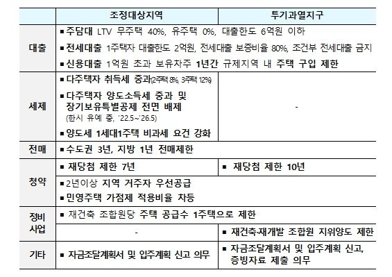 조정대상지역 및 투기과열지구는 기존에 지정되어 있는 강남구, 서초구, 송파구, 용산구 4개 자치구에 대해 지정을 유지하고, 그 외 서울 21개 자치구 전체와 경기도 12개 지역은 신규 지정한다.