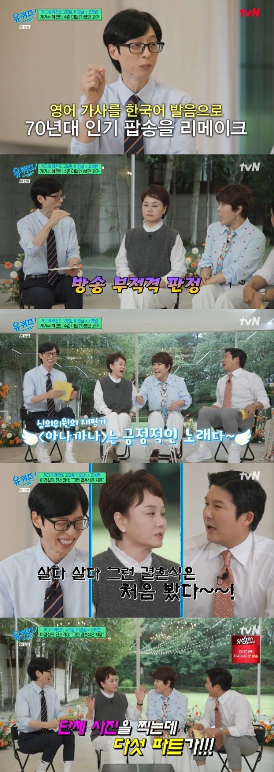 또 유재석은 조혜련에게 "새로운 길을 개척을 많이했다. 원조 개가수"라고 했고, 조혜련은 "'아나까나'가 KBS 방송 부적격 판정을 받았다. 가사가 저급하다고. 근데 얼마 전에 심의를 통과했다. 요즘 '아나까나'로 축가를 많이 불러서 분위기를 좋게 만들었다. 심의위원이 긍정적인 노래로 본 것 같다"면서 웃었다.