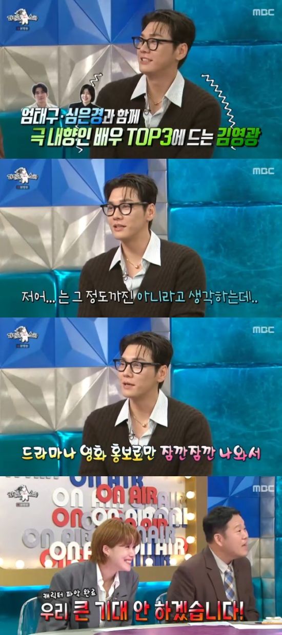 이날 김영광의 등장에 MC들은 "엄태구, 심은경 씨와 함께 연예계 대표 극내향인"이라고 했고, 김영광은 "극내향인은 맞는데, 그정도까지는 아닌 것 같다"면서 웃었다.