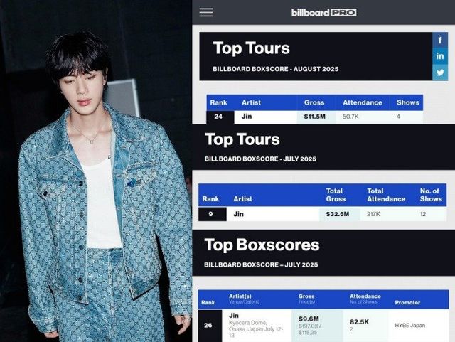 방탄소년단(BTS) 진이 단 4회의 무대로 유럽을 뒤흔들었다. 8월 빌보드 ‘Top Tours’ 월간 차트에서 24위에 오른 그는 한국 솔로 아티스트 중 유럽 공연 최다 수익과 최다 관객 기록을 동시에 세웠다.