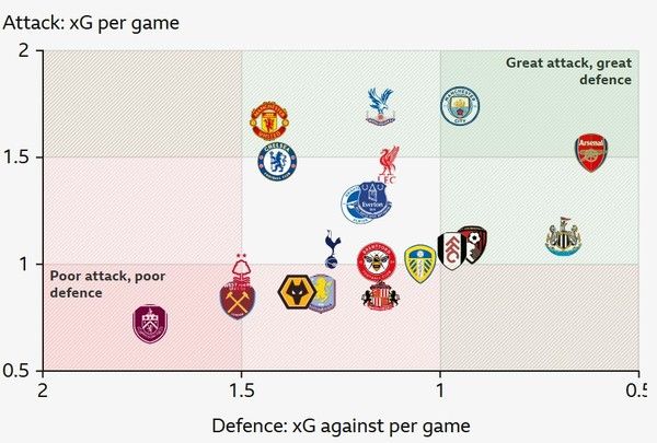 xG와 기대실점(xGA)을 모두 반영한 그래프에서 리그 1위 아스널은 예상대로 둘 다 최상위권이다. 만들어낸 xG도 상위권이고, xGA를 적게 내준 순위에서는 단연 1등이다.
