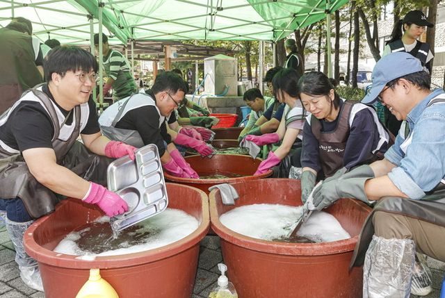 식기 세척 및 정리 작업을 하고 있는 한국GM 임직원들. ⓒ 한국GM