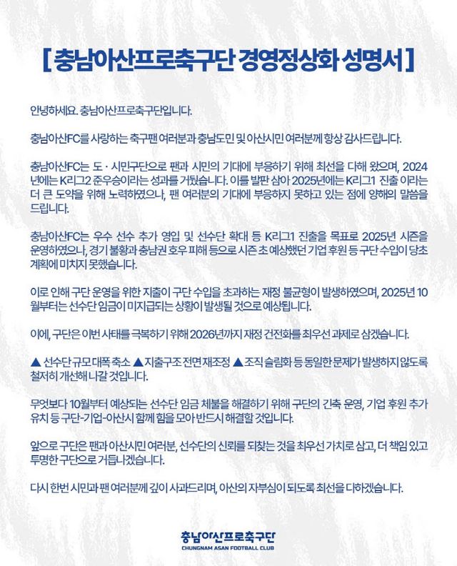 구단은 “우수 선수 추가 영입 및 선수단 확대 등 K리그1 진출을 목표로 2025년 시즌을 운영했으나 경기 불황과 충남권 호우 피해 등으로 시즌 초 예상했던 기업 후원 등 구단 수입이 애초 계획에 미치지 못했다”고 설명했다.