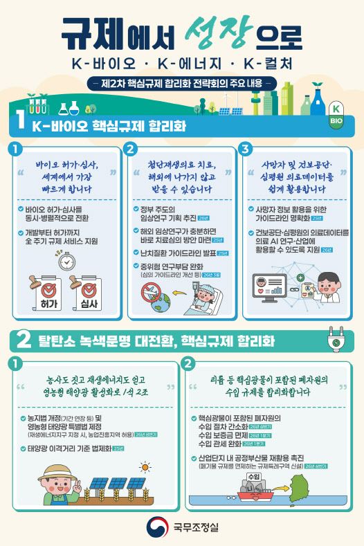 이번 회의는 바이오, 재생에너지·순환경제, K-컬처 등 신산업 분야의 과감한 규제합리화가 새로운 국가 성장의 동력으로 작용할 수 있다는 기대 하에, 규제기관의 ‘지원·육성기관으로의 전환’에 초점이 맞춰졌다.