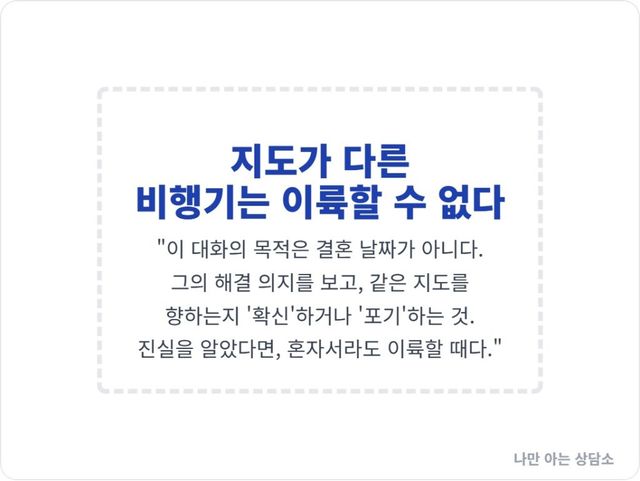 이 대화의 목적은 그를 설득하거나 압박해서 결혼 승낙을 받아내는 것이 아니다. 이것은 당신의 소중한 시간과 감정을 지키기 위해, 두 사람이 같은 목적지를 향해 항해하고 있는지 확인하는 ‘항로 점검’이다.