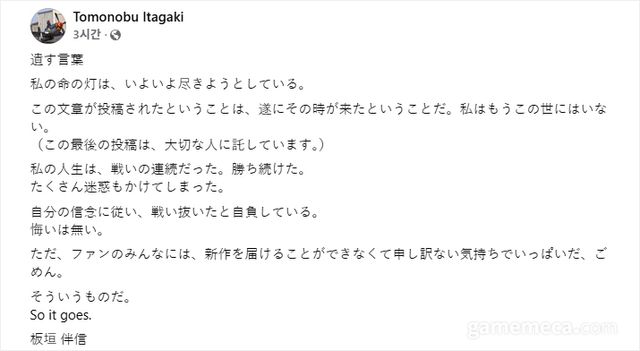 ▲ 이타가키 토모노부 부고 메시지 (자료출처: 이타가키 토모노부 페이스북)