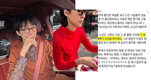 ‘빨간 옷’을 입어 해명했던 영상에 달린 댓글도 읽었다. 제작진이 “욕인지 칭찬인지 모르겠다”며 읽은 댓글 속 한 구독자는 “홍진경이라는 사람은 매번 뭔가를 그렇게 깊게 생각하고 계산해서 올리는 사람이 아니다”라고 장문의 글을 적었다.