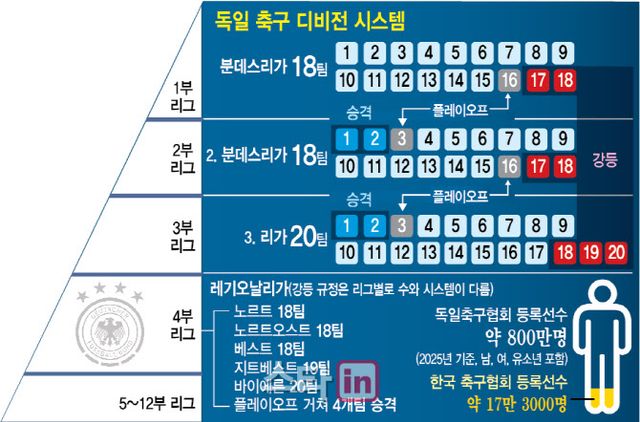 독일은 3부리그부터 프로로 인정한다. 이후 각 지역 단위로 리그가 분화된다. 시즌을 마치면 리그별 우승 및 하위팀이 상하 리그로 오르내린다. 이런 개방성은 승강제의 심장이다. 아무리 작은 구단이라도 긴장과 희망을 불어넣는다. 선수들은 더 높은 목표를 바라보고 꿈을 이루기 위해 사력을 다한다.