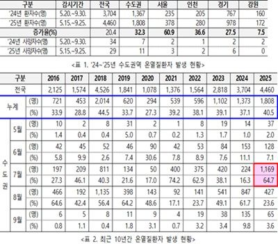 2025년 5월 15일부터 9월 25일까지 운영된 온열질환 응급실감시체계에 따르면, 전국 온열질환자 4,460명 중 40.5%인 1,808명이 수도권역에서 발생했다.