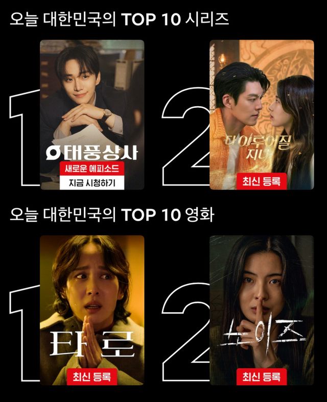 16일 넷플릭스가 집계한 ‘대한민국 톱10 시리즈’에는 ‘태풍상사’, ‘다 이루어질지니’, ‘내겐 너무 까칠한 매니저-비서진’, ‘크라임씬 제로’, ‘우리들의 발라드’, ‘은중과 상연’, ‘체인소 맨’, ‘폭군의 셰프’, ‘스파이 패밀리’, ‘퍼스트 레이디’가 차례로 진입했다.