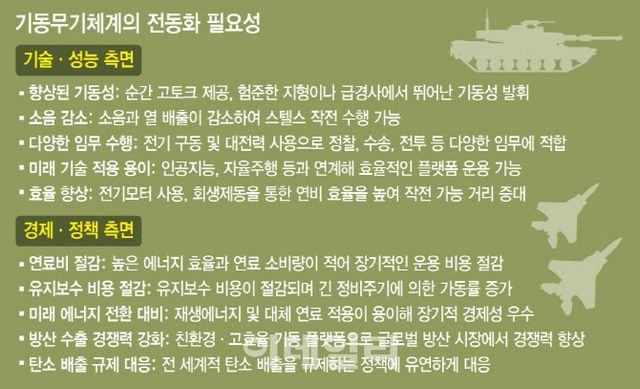 하지만 전차, 장갑차 등 기동무기체계에서는 경제성뿐만 아니라 작전 기동성, 항속 거리, 저소음 운용, 탐지 회피 등의 작전 성능이 핵심 고려 요소다. 전기 구동방식은 초기부터 고(高) 토크 운용이 가능하므로 가속 및 기동 성능이 우수하며, 저소음과 저발열 특성은 탐지 가능성이 낮아지므로 승무원 생존성 향상에도 유리하다. 더 많은 전력을 필요로 하는 미래 임무 장비 탑재에 대비하기 위해서는 전동화 전환은 필수다.