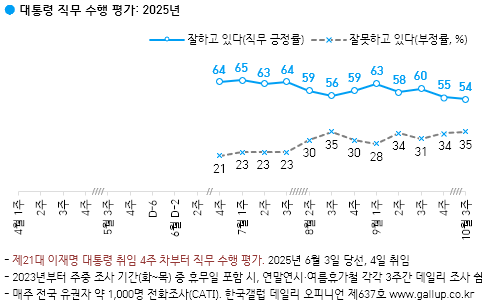 한국갤럽이 지난 14~16일 전국 만 18세 이상 남녀 1001명을 대상으로 이재명 대통령의 직무수행 평가를 조사한 결과 (95% 신뢰수준에 ±3.1% 포인트) '잘하고 있다'는 긍정평가는 54%, '잘못하고 있다'는 부정평가는 35%로 나타났다. 10%는 의견을 유보했다. 추석 전에 실시된 직전 조사에 비해 긍정은 1%p 하락했고, 부정은 1%p 상승했다.